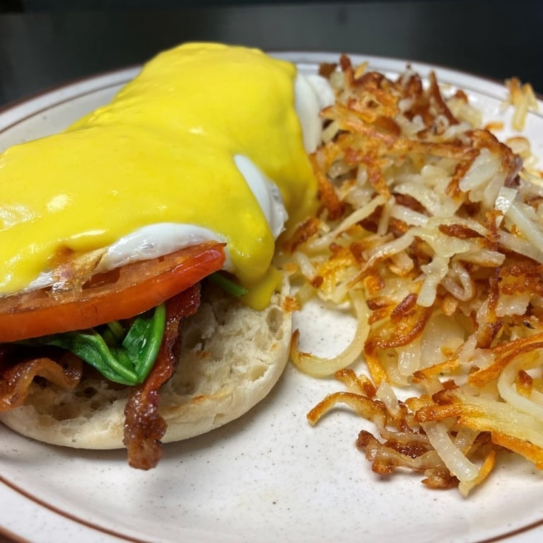 Two basted eggs, bacon, spinach, tomatoes and creamy Hollandaise atop an english muffin served with one choice selection