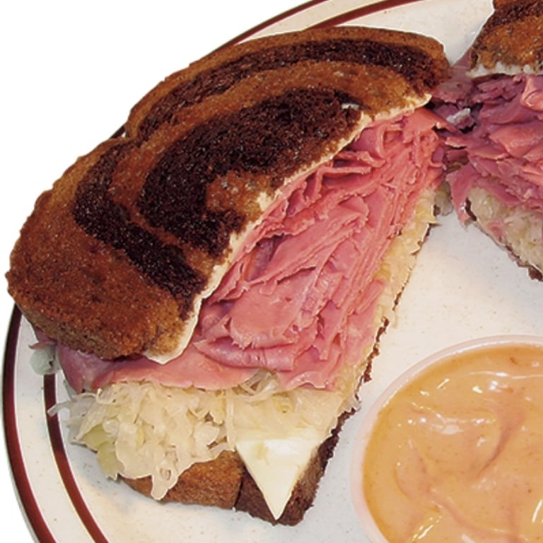 Thinly sliced corned beef stacked high on grilled marble rye with Swiss cheese and sauerkraut. 1000 Island dressing served on the side