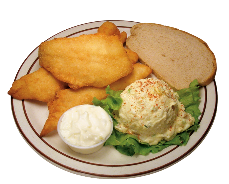 Alaskan Pollock. Includes choice of wild rice blend or French fries or potato salad plus coleslaw, rye bread, and sauce